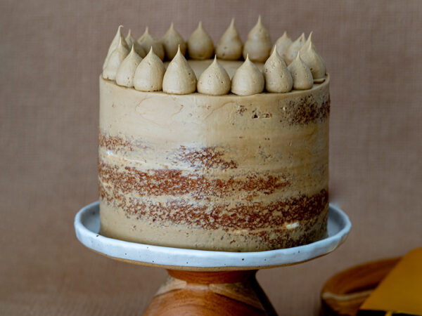 Coloque o bolo gelado em uma bailarina e então, com auxílio do saco de confeiteiro, espalhe a cobertura por toda a lateral.
