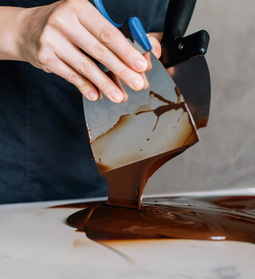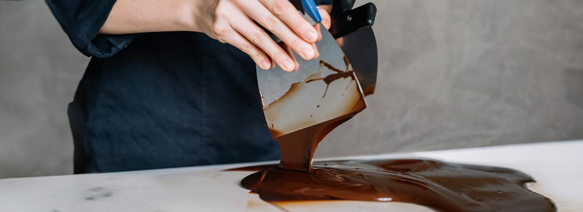 • Uma vez na bancada o chocolate deve ser movimentado e trabalhado com uma espátula e um raspador até seu resfriamento na temperatura adequada (4 a 5 graus abaixo da temperatura de trabalho)*.