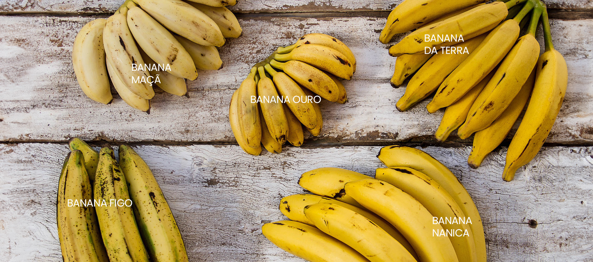 - Banana nanica (banana-caturra, anã, cavendish ou banana d´agua): de nanica, não tem nada – mas recebe o nome pelo pequeno porte da bananeira que a produz. Tem casca fina, amarelo-esverdeada, mesmo quando madura. É uma das mais úmidas e de sabor mais adocicado, perfeita para bolos e doces em geral. Quando a casca estiver toda amarelada, está madura e firme, o ponto ideal para ser consumida!